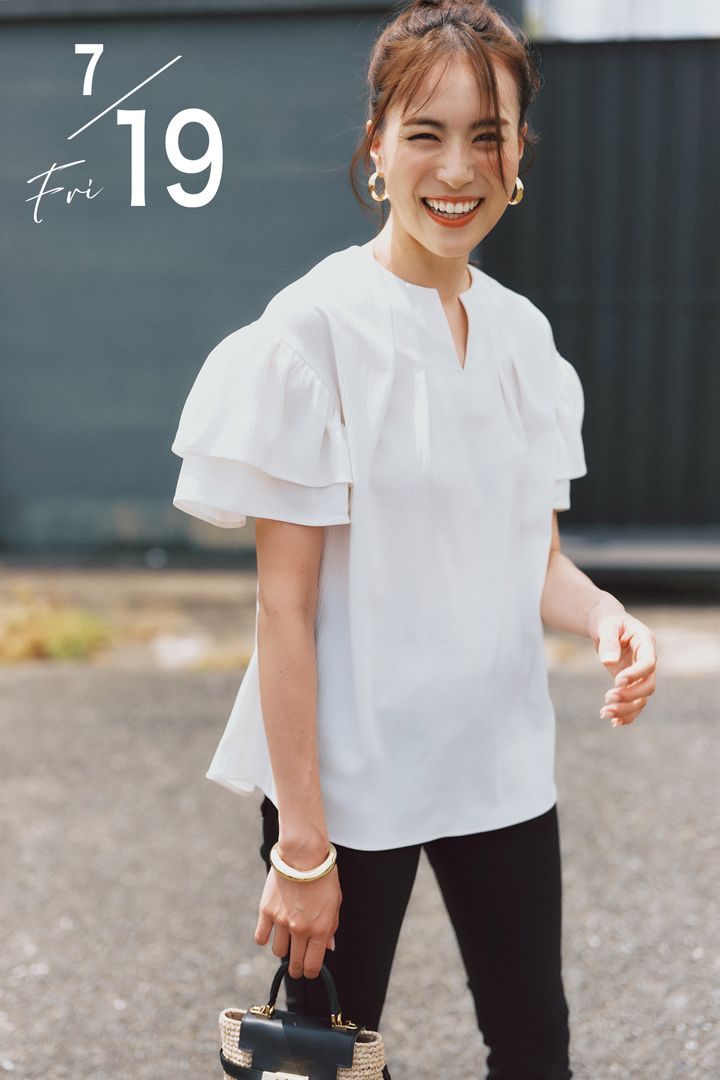 ゆるっと着られるブラウスは細身パンツと相性抜群。キーネックは顔まわりをすっきり見せてくれる効果も。花びらモチーフの立体袖とエンボスサテンの涼しい素材で夏らしく。