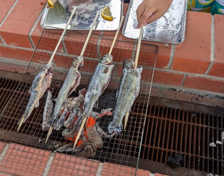 焼き台に移動して魚に塩を振り焼いていきます。炭の良い香りに皆テンションMAX(笑)串刺しにした魚を頂くのは私も初めてでしたが、もう絶対美味しいに違いない!と期待は膨らみました
