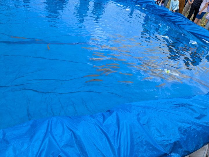 さすがに川で魚獲りをするのではなく、巨大なビニールプールの中でです