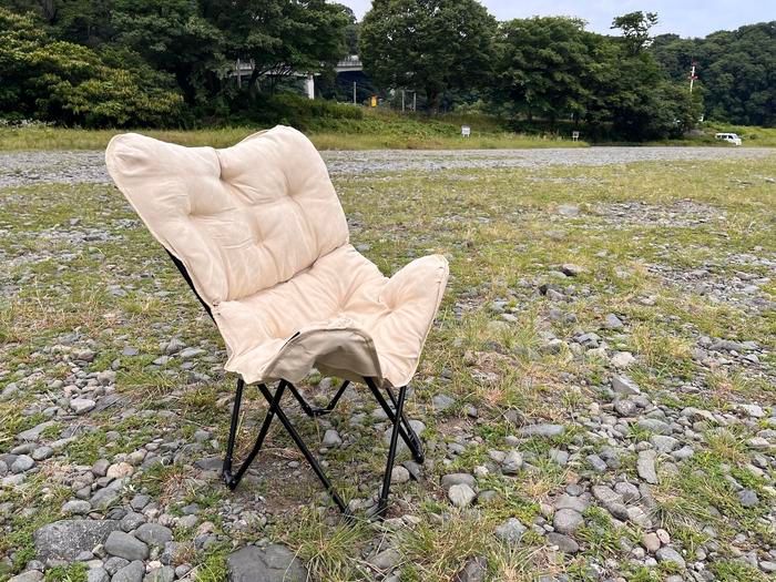 1つ目は、「アウトドアリラックスチェア」。座面と背もたれに中綿が入っており、まるでソファのような贅沢な座り心地が魅力です。見た目に高級感があるので、写真映えも期待できそう。