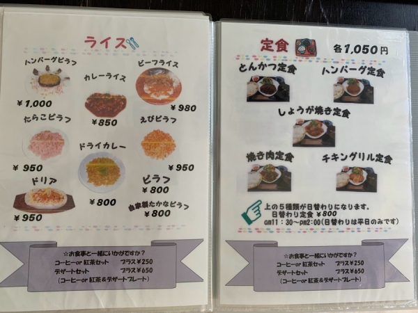 定食は定番のハンバーグ定食、焼き肉定食、しょうが焼き定食、とんかつ定食、チキングリル定食と揃ってます!