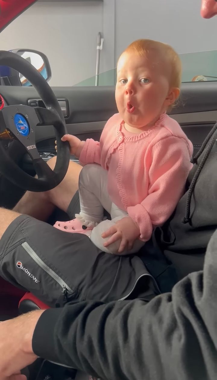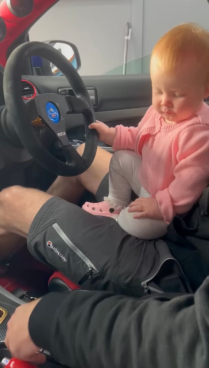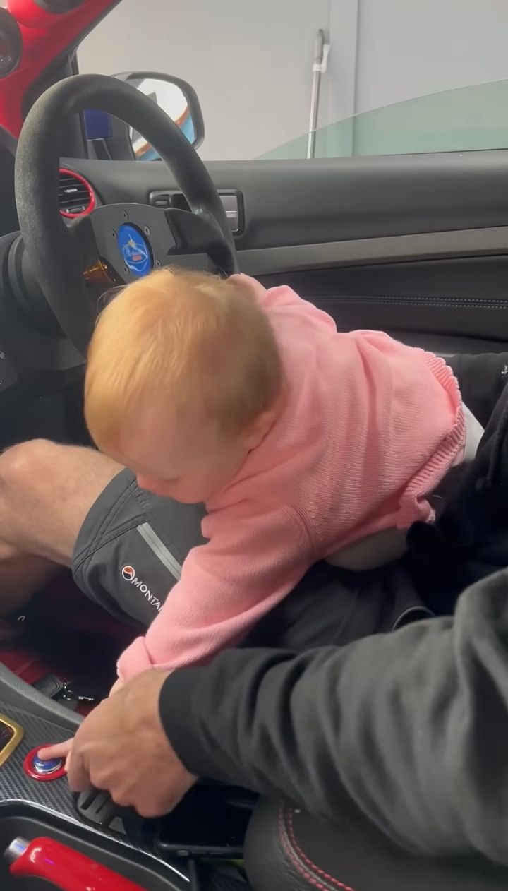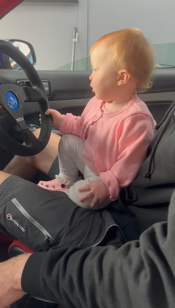 そんな赤ちゃんの手をエンジンボタンへと導くパパ。 エンジンをかけたら赤ちゃんはどんなリアクションを見せるのでしょうか??