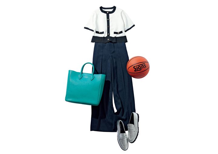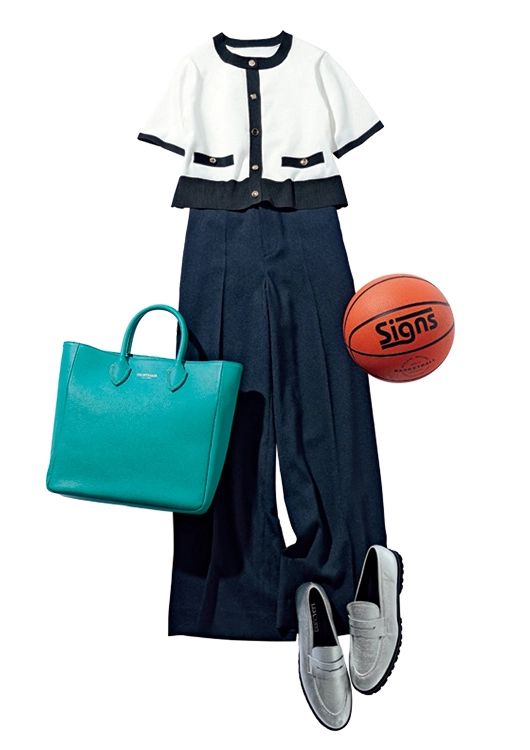 半袖カーディガン¥14,300/ジャスグリッティー パンツ¥14,960/インディヴィ(ワールド) トートバッグ¥42,900/ドレステリア(ドレステリア 渋谷スクランブルスクエア店) ローファー¥39,600/ブランベール(ウールン商会)