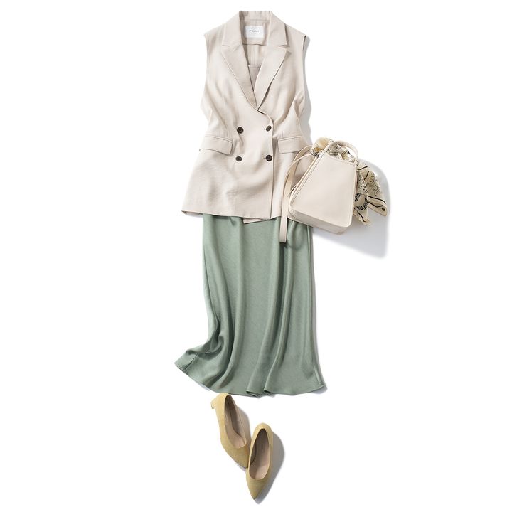 ジャケット代わりにもなるジレは、セットアップでよりハンサムに。ジレ¥9,350パンツ¥7,150(ともにオペーク ドット クリップ)