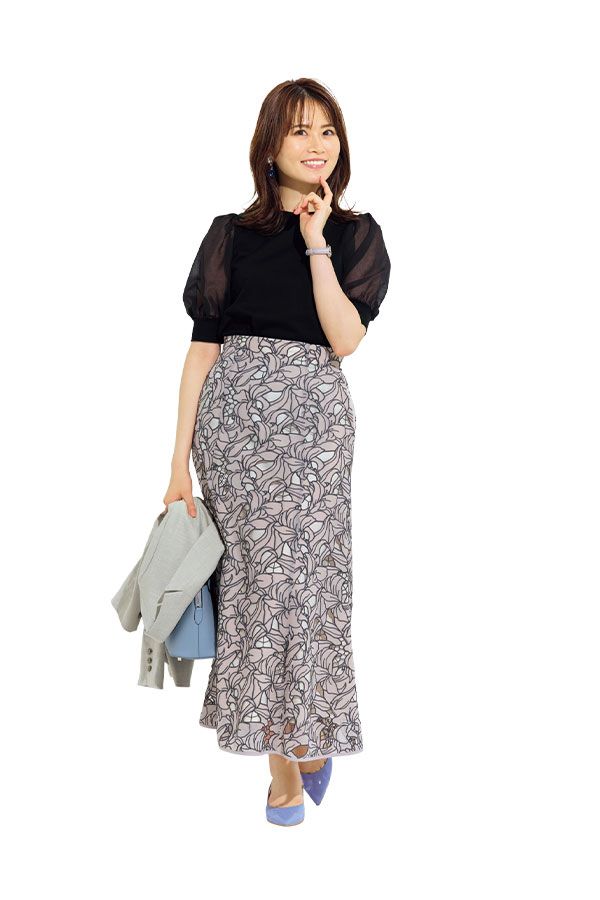 ジャケット¥27,500/ストラ カットソー¥11,000/ストロベリーフィールズ(シュガー・マトリックス) スカート¥17,600/MERCURYDUO(MERCURYDUO ルミネエスト新宿店) バッグ¥176,000/ボナベンチュラ パンプス¥17,050/ダイアナ(ダイアナ 銀座本店) ピアス¥20,900/masae(ロードス) 時計¥3,080/J-AXIS(サン・フレイム)
