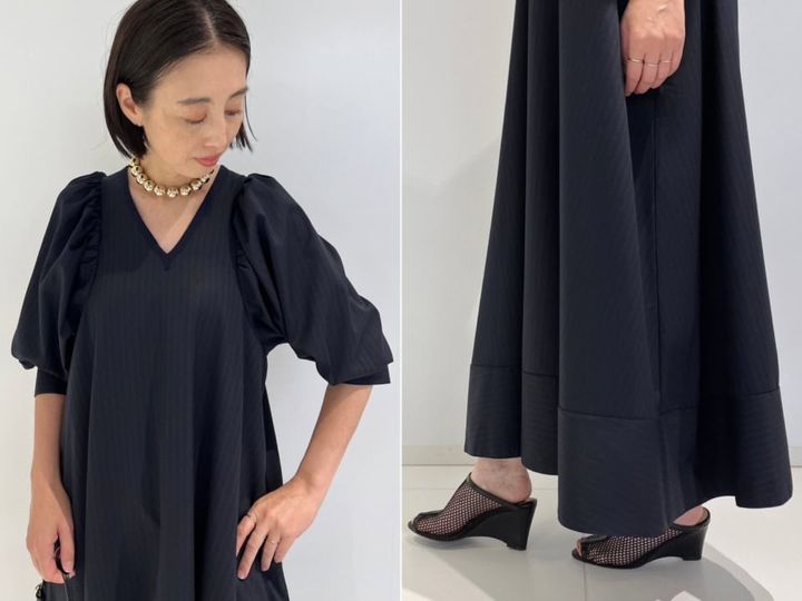 「形そのものから別注をかけて作っていただいた特別な一枚。ディテールには甘さもありつつ、ネイビーのピンスト生地を使用することでメンズライクなムードも相まって着やすいドレスに仕上がっています。ヘムラインに切り替えがあるのも、さり気ないデザインポイントです」ドレス¥41,800(ア ピューピル※ジャーナル スタンダード レサージュ別注/ジャーナル スタンダード レサージュ 丸の内店)