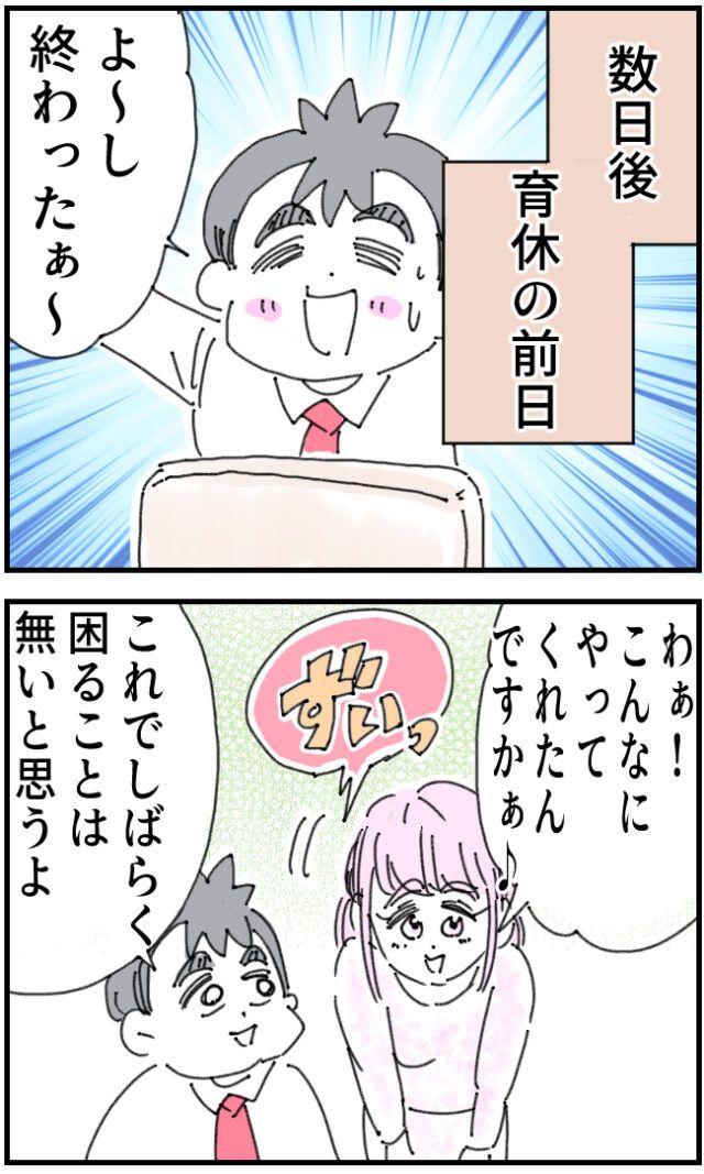 そして数日後、育休前日のこと、「よ~し、終わったぁ~!」と達成感でいっぱいのいちろうさん、そこに「わぁ!こんなにやってくれたんですかぁ!」と後輩の白石さんがやって来ました。「これでしばらく困ることはないと思うよ」といちろうさんが言うと、白石さんがやって来ました。
