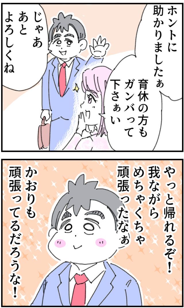 「ホントに助かりましたぁ。育休の方もがんばってくださぁい」そういちろうさんにお礼を言う白石さんに、「じゃあ、あとよろしくね」そう言っていちろうさんは会社を後にしました。