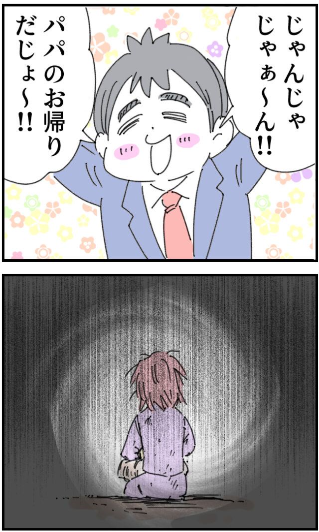「じゃんじゃじゃぁ~ん!!パパのお帰りだじょ~!!」とやっと家に帰れて大喜びのいちろうさん、でもその場にいたかおりさんは立ち上がることもできず座り込んでいたのでした。