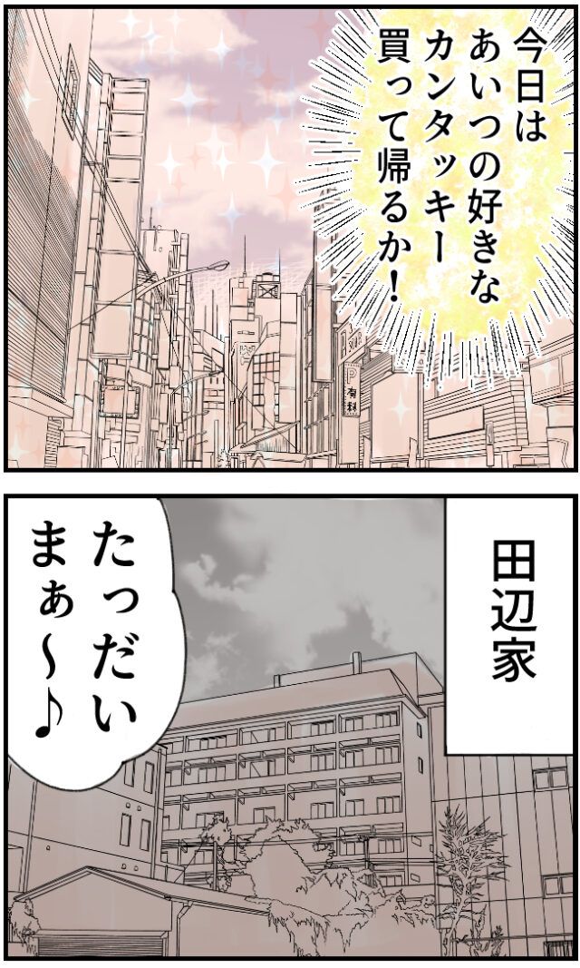 そして「そうだ!今日はあいつの好きなもの買って帰るか!」と思い立ち、かおりさんの好きな食べ物を買って帰ることに。そして「たっだいまぁ~!」田辺家に到着しました。