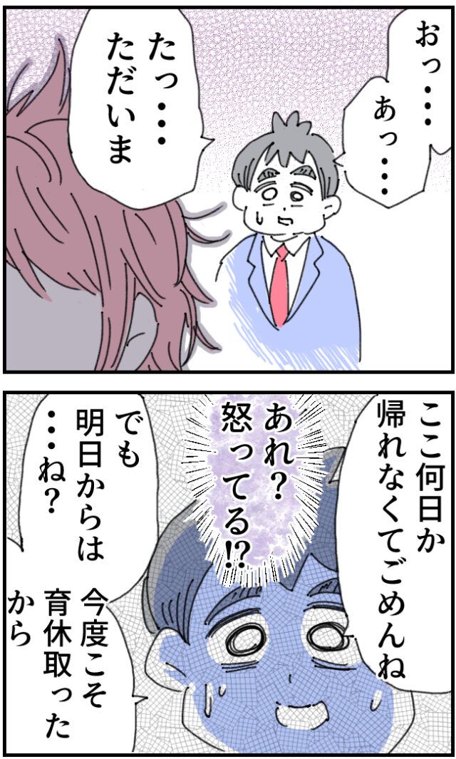 いちろうさんは「あれ?怒ってる?」そう思いながらも話しかけました。「ここ何日が帰れなくてごめんね。でも、明日からは・・ね?今度こそ育休取ったから・・」そう声をかけても相変わらずかおりさんは何も答えません。