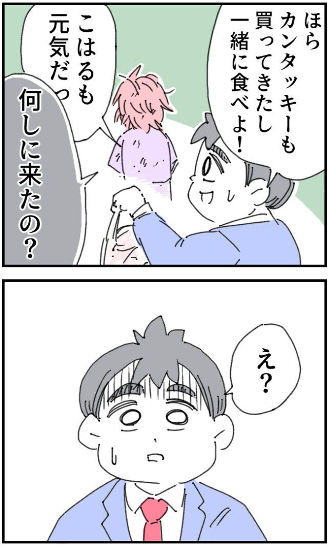 「ほら、フライドチキンも買って来たし一緒に食べよ!こはるも元気だっ・・」と話しかけると「何しに来たの?」とかおりさんの声がしました。「え?」思いがけないかおりさんの言葉にいちろうさんは驚きました。