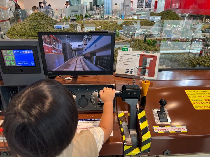 鉄道シュミレーションはジオラマに走っている電車の1車両の先頭がカメラになっていて、まるで本物の電車を運転しているかのような臨場感が味わえます。