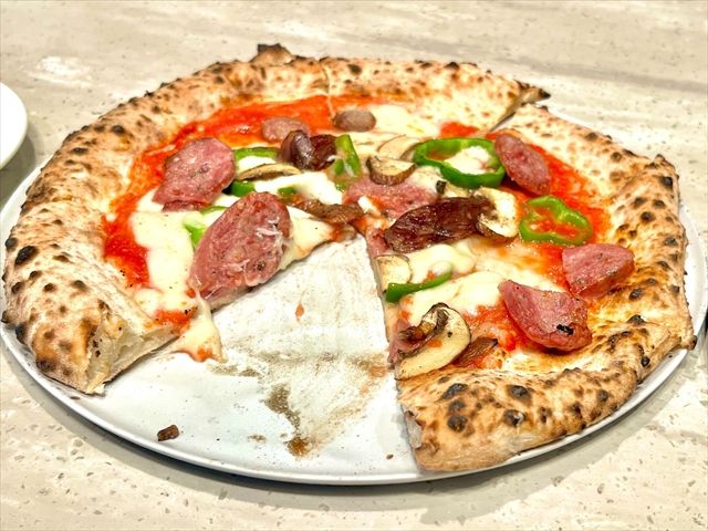 噛めば噛むほど旨味が出るシカのサラミと、ジューシーなイノシシのサルシッチャ、風味豊かなマッシュルームなど、素材のよさが活かされた具材と、塩味のきいたチーズがマッチしています。