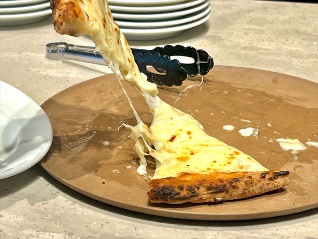 1ピース切り分けると、びよ~んと伸びるチーズ。これを見ただけでも、おいしそうなのが伝わってきます!