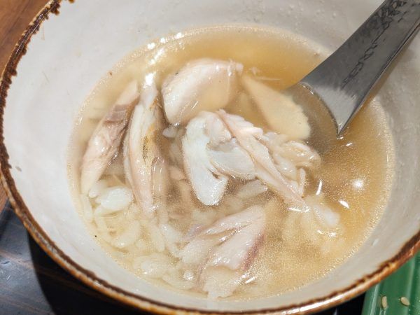 〆に、ほぐした魚の身とお茶漬け用の出汁、だし醤油をご飯へ。旨みが溶け込んだコクのあるおいしいお茶漬けの出来上がり♪ 魚もやわらかいのでスルスルと胃の中へダイブしていきます。