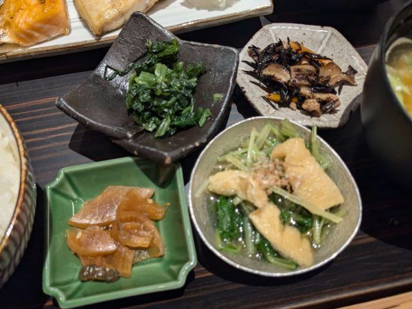 小鉢は、青菜の辛味和え、ひじき煮、水菜と筍のおひたし、お漬物と4皿も。上品な味で、ホッと一息箸休め。