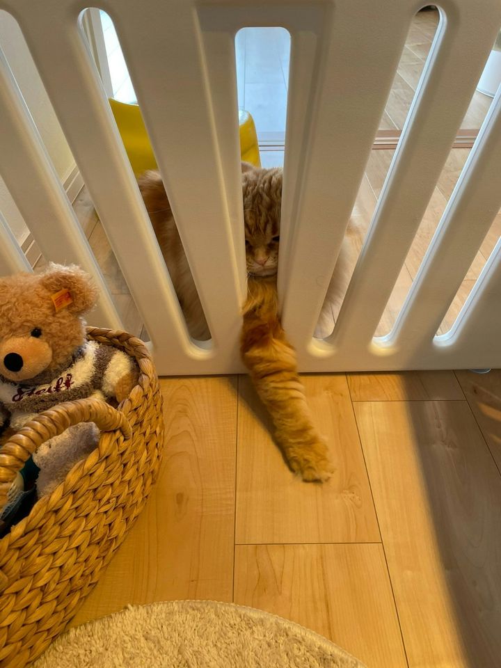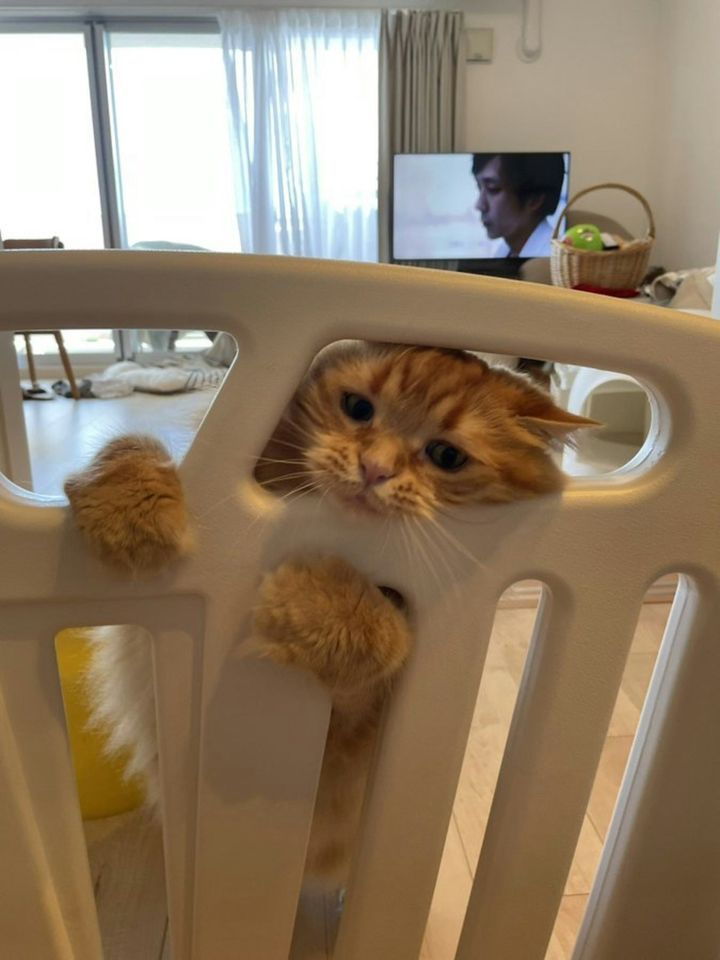 ベビーサークルの隙間からどうにかして入り込もうとしている、ちくわちゃん。かろうじて顔は入ったものの、残念ながら体までは難しそうです。赤ちゃんのそばに行きたくてこんなに一生懸命になるほど、赤ちゃんが大好きなんでしょうね。