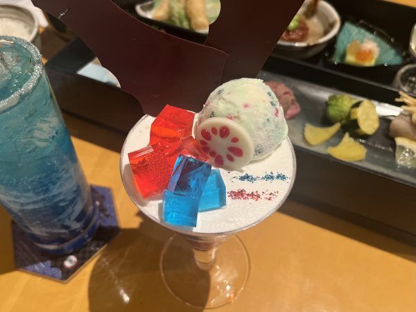 「ハイカラ・ベリー&チョコレートパフェ」と名付けられた、ド派手で華やかな「宇髄天元」をイメージしたカラフルな和スイーツは、しっとりスポンジと、ぷるぷるゼリーが入った食感も楽しいスイーツ(1200円)。