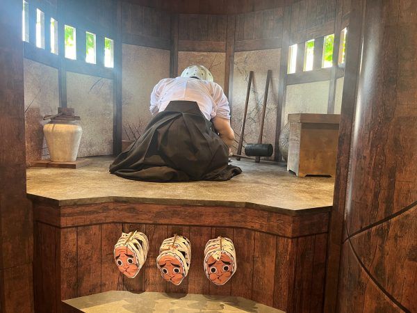 「鬼滅の刃 XRライド」すぐ横にあるオリジナルグッズを販売するショップでは、思わずビクっとしてしまうリアルなディスプレイ、炭治郎の日輪刀を手掛ける刀鍛冶・鋼鐵塚蛍(はがねづかほたる)がお目見えです。