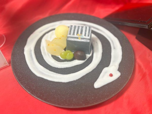 見るだけで、VRコースターの恐怖を思い出す「渦巻く黒胡麻ムース」。蛇柱・伊黒小芭内をイメージした和のスイーツです(1000円)。