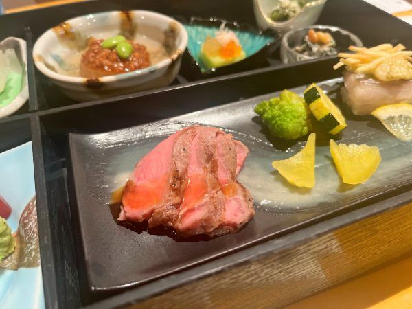 大人には、ちょっと贅沢に「霞の松花堂御膳」はいかがでしょう。霞の呼吸の使い手、クールで透明感ある時透無一郎をイメージした御膳には、牛ステーキをはじめ、お造りや天婦羅など盛りだくさんな内容です(4200円)。