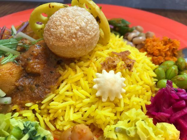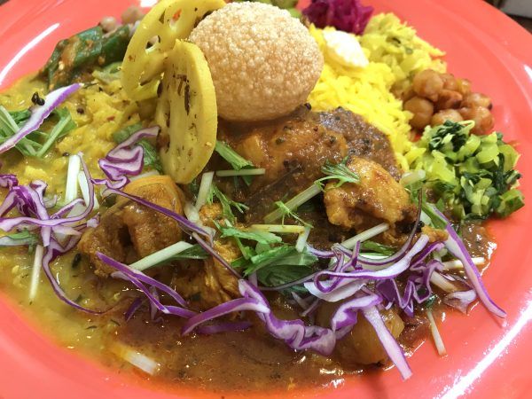 てっぺんにちょこんと鎮座するのは「パニプリ」と言うネパールで食べられているお菓子。これがピースカレーさんのランカプレートの目印です! 中が空洞になっているんですが、現地ではパニプリに穴を空けて、ジャガイモや豆を入れてスパイス水をかけて食べるんだそう。おもしろそうですね。食べてみたいものです。私はいつも手で砕いてカレーにパラパラかけちゃいます。