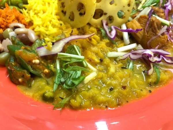 スリランカカレーの基本はパリップ(豆カレー)。見た目よりさらっとしていて、口に入れるとココナッツミルクのやさしい甘みが広がります。スパイスもしっかり効いています。