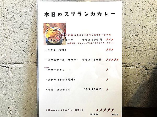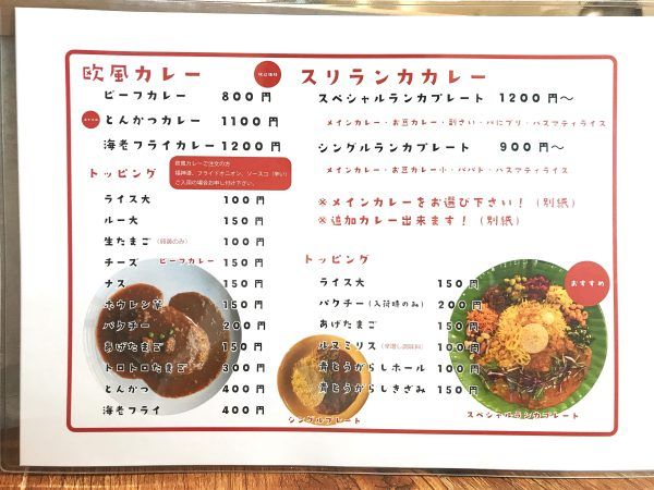 欧風カレーとスリランカカレーを提供されている、めずらしいお店なんです。 カレー屋をすると決めた店主さんが、さまざまなカレーを食べて一番おいしいと思ったスリランカカレーと、以前洋食屋さんをされていた経験から欧風カレーを出すことにしたんだそうです。