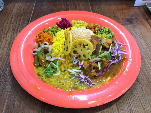 全部で9種類の副菜がずらっと並び、とっても豪華!お野菜もたくさん摂れて嬉しい! この日の副菜は、オクラ・サラダ豆・人参・小松菜・枝豆・レッドキャベツ・キャベツ・ひよこ豆・レンコン。 どれも違う調理法、違うお味の副菜たち。食感もさまざま。いや~、ホントに豪華です!