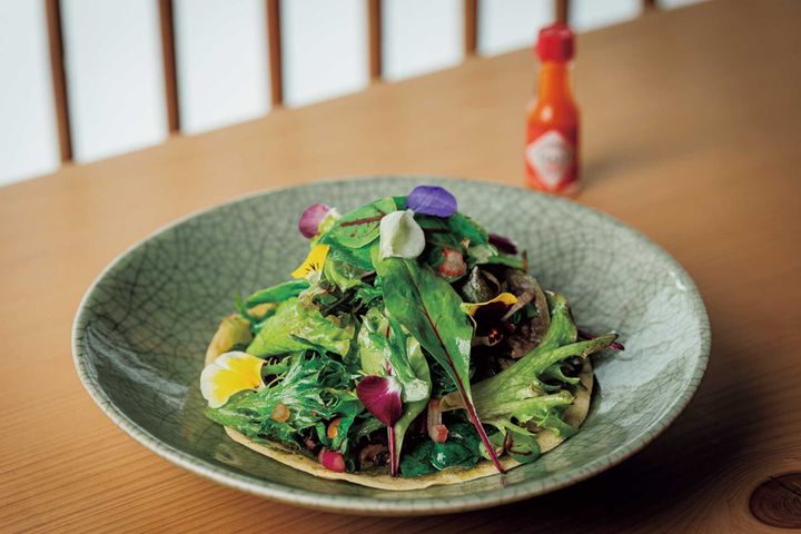瑞々しい鎌倉野菜の下には、イベリコ豚のチャーシュー、アボカドとナッツ、トマトのサルサを重ねたトルティーヤが。まずはサラダとして、それから自家製タバスコをかけてタコスとしてどうぞ。