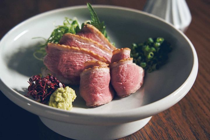表面を焼き付けた後、低温でじっくり火入れした鴨肉をさらに出汁に漬ける。ロゼ色に仕上げた身は柔らかく、噛むごとに旨みが広がる。津軽鴨のロースのたたき¥1,630