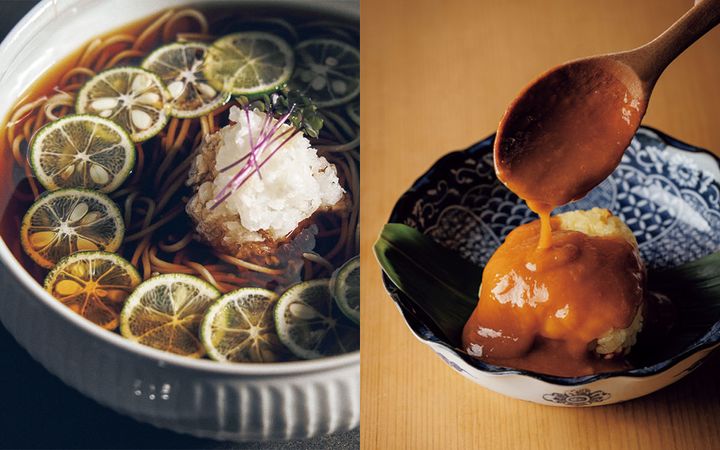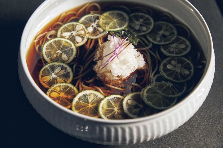のど越しのよい蕎麦をすだちスライスと鬼おろしで爽やかに食す一杯。出汁にどんこ椎茸、かえしに小豆島の醤油を使ったつゆは風味豊か。鉢は大分で作陶している阿南維也さんのもの。料理がぐっと引き立つ、器のセレクトにも注目を。すだち鬼ぶっかけそば¥1,760