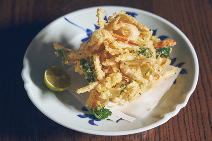 富山湾産の白海老に、にんじんと三つ葉の彩りを添えて。さっくりとした口当たりとともに白海老ならではの上品な味わいが楽しめる。白海老のかき揚げ¥1,200