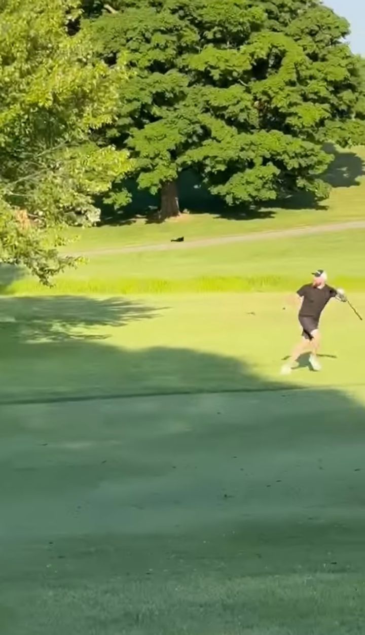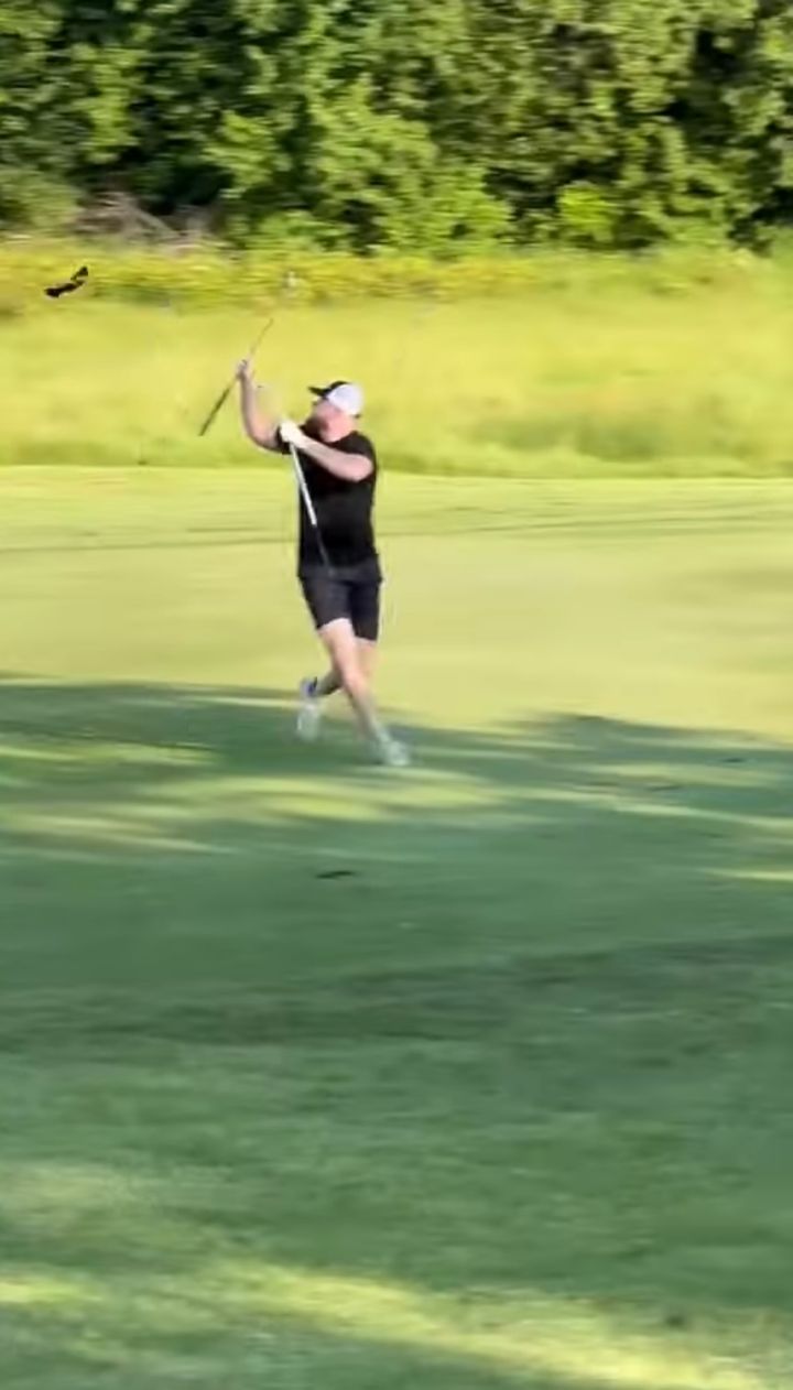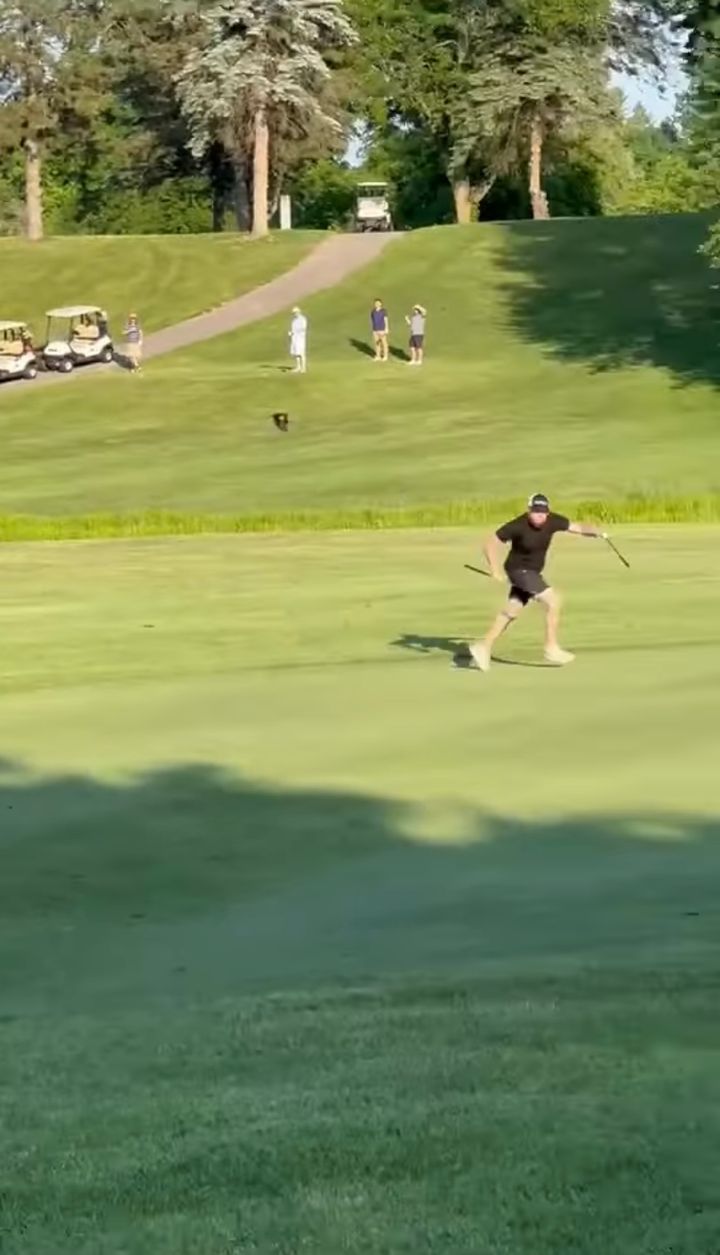 クラブを握りしめてホールを逃げ惑うゴルファー。 この時、男性はピンチに陥っていたのです!!
