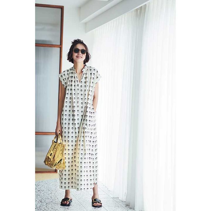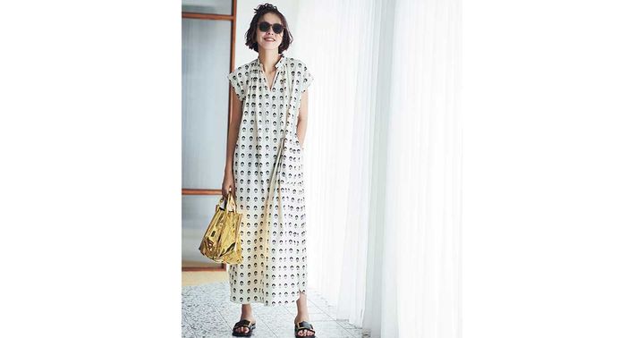 ワンピース¥29,700(ヌキテパ/パサンドバイヌキテパ)サングラス¥47,300(アイヴァン/アイヴァン東京ギャラリー)ピアス¥3,410(Boobijou room/サージュブティック)バッグ¥14,080(バーセルフ)サンダル¥13,970(ミラオーウェン/ミラオーウェンルミネ新宿2店)