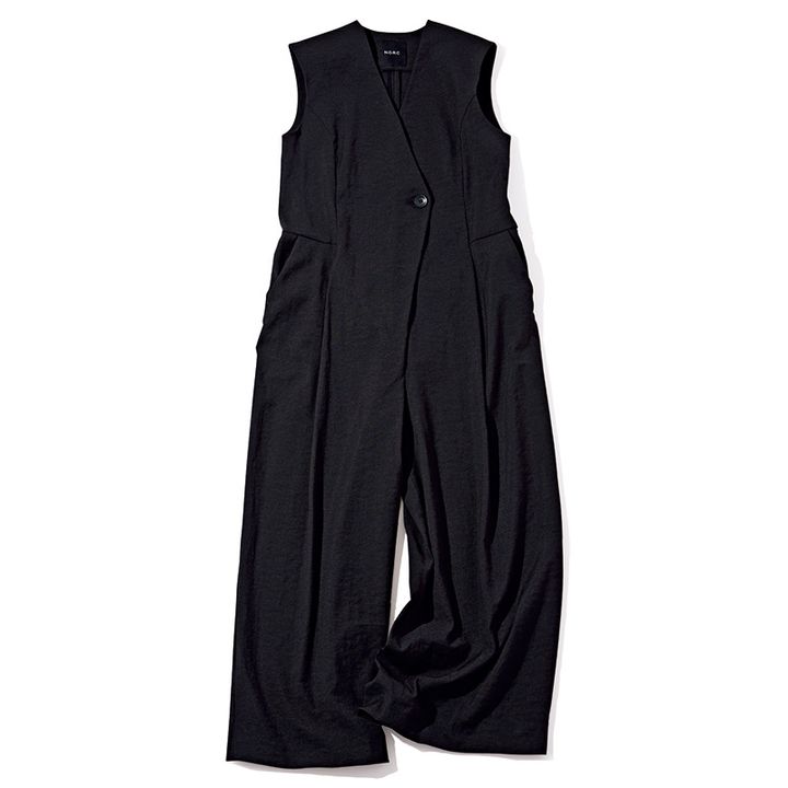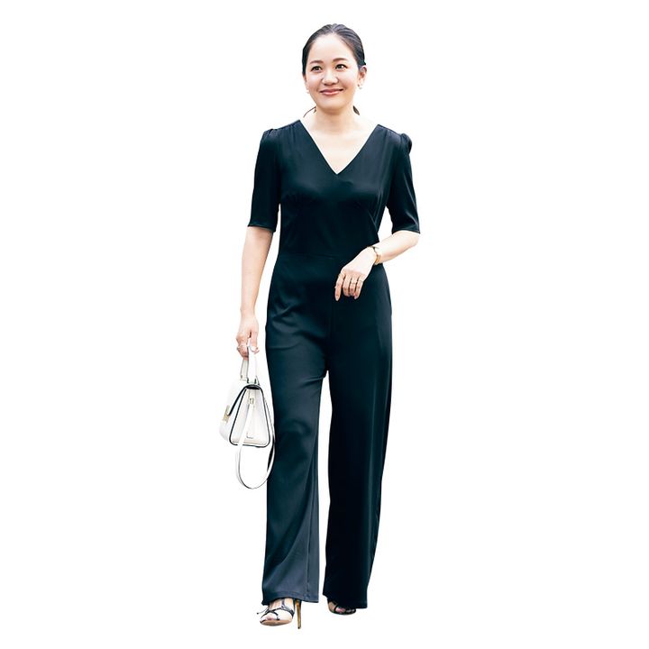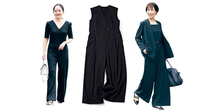 黒パンツ+白ブラウスに匹敵するきちんとアイテムとしてすっかり定着した黒オールインワン。夏はとろみ素材やツヤ感がある選びがポイント。