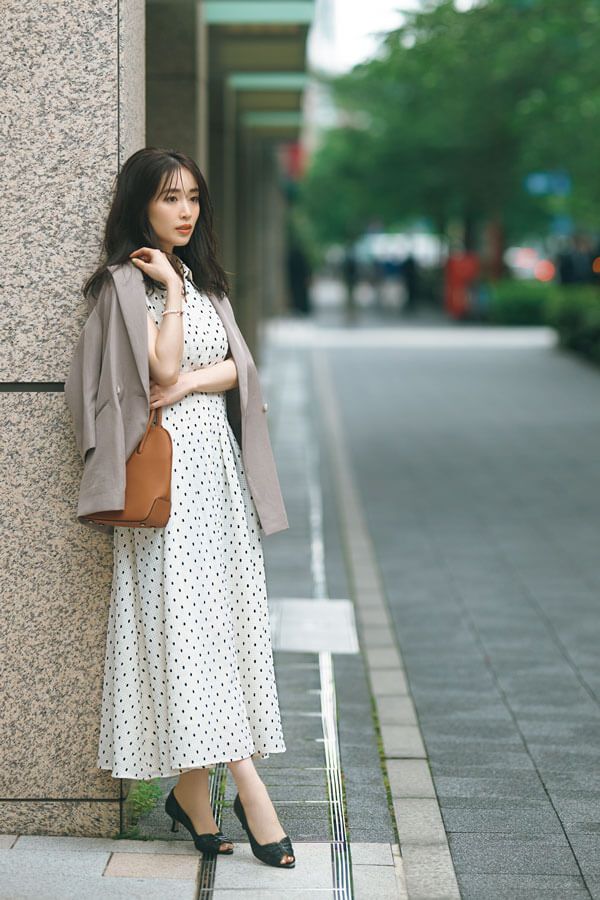 テーラードジャケットの肩掛けで女っぽドットワンピにきちんと感を