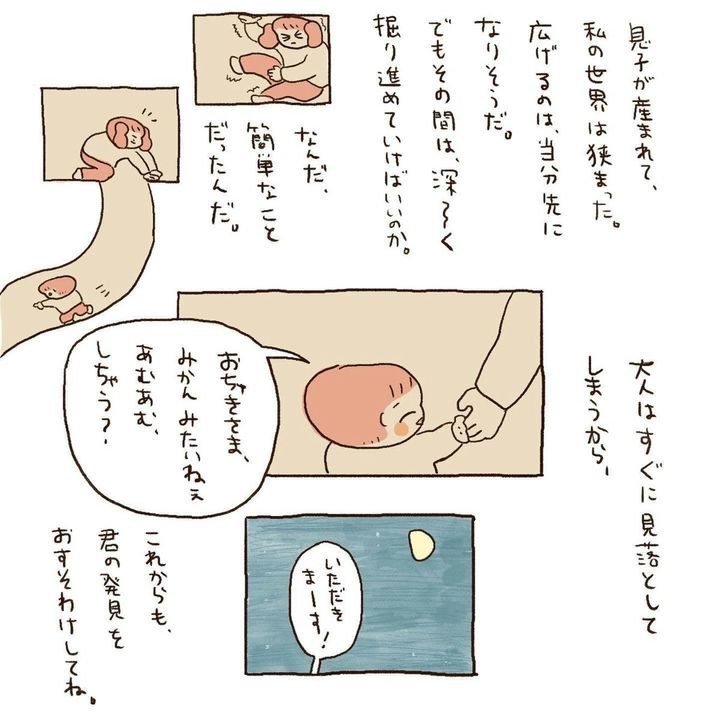 大人の生活と比べると一見地味で、普通で当たり前に思える育児の毎日。伊藤ぽんぽこさんがいうように、「大人はすぐ見落としてしまう」のですね。伊藤ぽんぽこさんの投稿にも、「モヤモヤを言語化していただきありがとうございます」「今まさに虚無です…息子と早く色んな発見をして世界を深く広げていきたいなと思いました」と、共感の声が寄せられていました。
