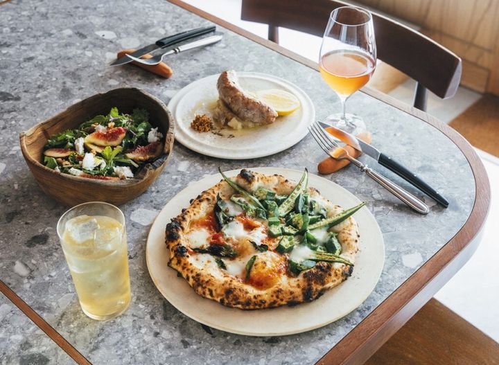 マルゲリータとオクラのピザ(2500円)に窯焼きで仕上げる新潟もち豚の自家製サルシッチャ(2200円)。千葉県「苗目」のハーブが輝く、いちじくと鹿児島コトブキ リコッタチーズのグリーンサラダ(1600円)。グラスワイン(1100円~)にOpen Book レモンチェッロソーダ(900円)と共に。