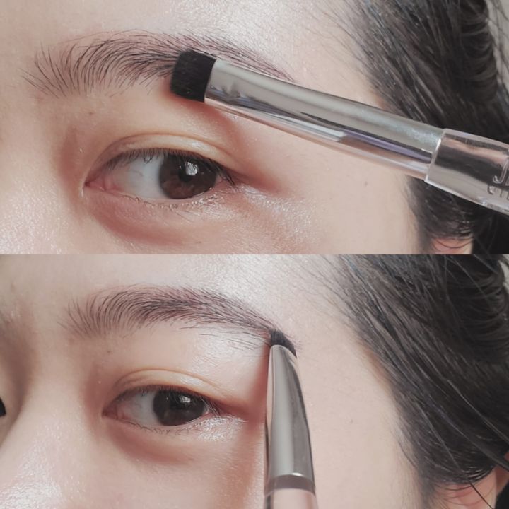 3色のうち左端と中央をまぜて、手の甲やティッシュの上などで色をなじませてから、眉中から眉頭へむけて全体的にブラシでのせる。