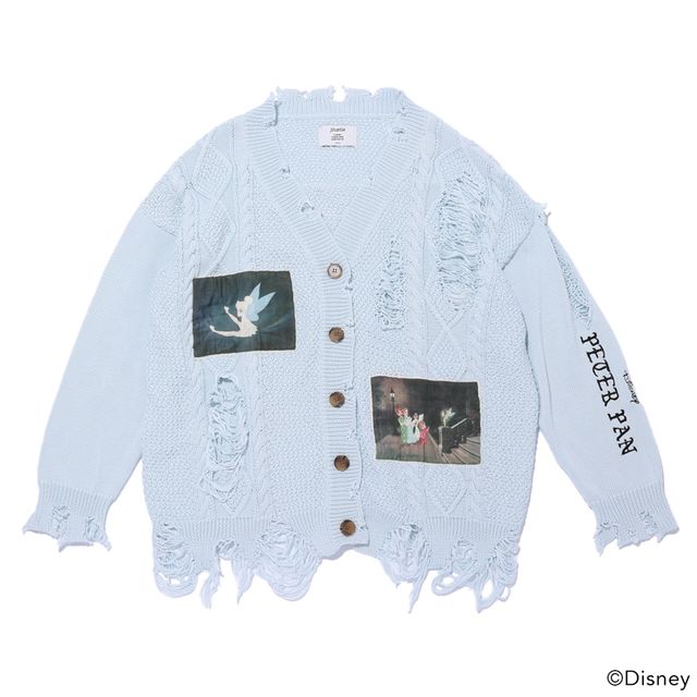 身頃と袖に大胆なクラッシュ加工と、裾にもダメージを施したヴィンテージ感たっぷりのニットカーディガン。ストーリーのワンシーンをガーゼにプリントし叩きつけたこだわりの1枚です。ピーター・パン&ティンカー・ベル、ウェンディ、フック船長、それぞれキャラクターイメージに合わせたボディカラーにも注目!