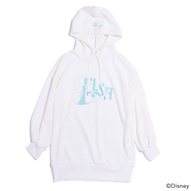 今秋トレンドのフーディアイテム。フロントのインパクトあるプリントデザインが華やか。ドレス部分にはラインストーンを散りばめて、ドレスアップしたようなムードに。オーバーサイズでざっくりと着こなせるサイズ感です。