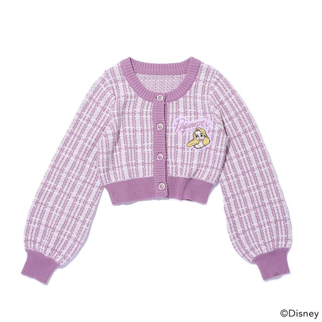 人気のツイード素材に「ラプンツェル」のヘアカラーをイメージした上品なゴールドカラーのラメ施し、華やかに仕上げたコーディネートの主役になるクロップド丈のカーディガン。1枚持っておけば寒いときも安心。