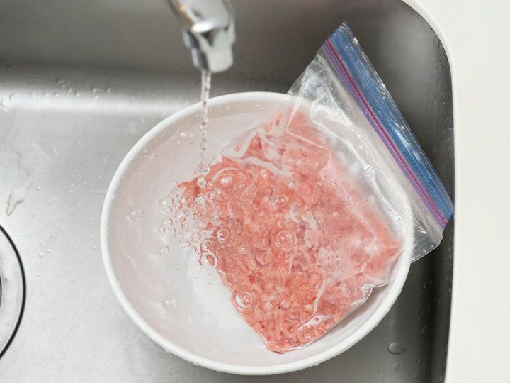 冷凍で活動が抑えられていた菌は、常温で再び活性化。特に火を使うキッチンでの常温解凍は危険です。基本は冷蔵庫での低温解凍。急ぎの場合は、流水解凍か電子レンジ解凍で。流水解凍する場合は、保存袋に入れたままボールに入れ、流水に当てて。