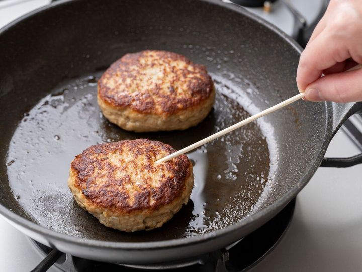 食中毒の原因で多いのが、生焼けの肉を食べること。食中毒菌を死滅させるには、肉の表面だけでなく、中の色が完全に変わるまでしっかり火を通す必要があります。特にハンバーグやチキンソテーなどは中心部が加熱しきれていないと食中毒を起こしやすいメニュー。肉汁の色や断面の色など見た目での確認が重要です。