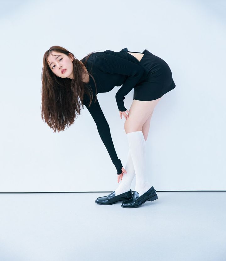 それでいて、締まった黒の色味と見せすぎない肌見せセンスで今っぽいクリーンさが生まれてる。足元を白ハイソックスと黒ローファーにすることで、おしゃれなハズしをオン。