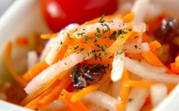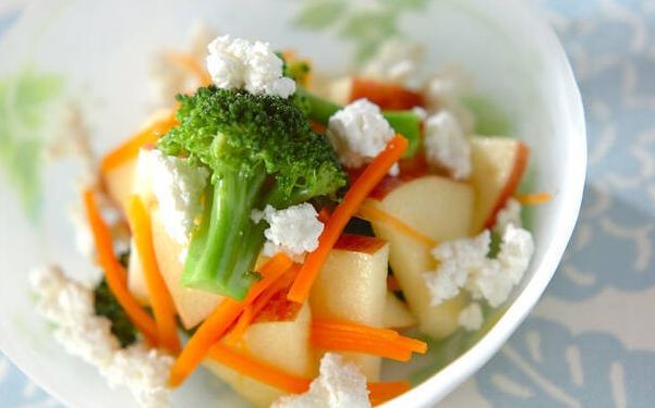 イチョウ切りのリンゴがアクセントに。ニンジンは電子レンジで加熱すれば、茹でる手間を省けます。仕上げにカッテージチーズを散らしましょう。お店のようなサラダが完成しますよ。