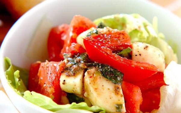 トマト、モッツァレラ、バジルの彩りが美しいサラダです。チーズの中でもモッツァレラは淡泊なため、ステーキとの相性も抜群。EVオリーブ油ベースのシンプルなドレッシングをかけて召し上がれ。