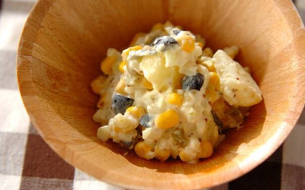 2種類のオリーブを混ぜ込む、風味豊かなポテトサラダ。一口頬張ると、ほんのりオリーブが香りが! マヨネーズソースは粒マスタード入りで、ツブツブ食感も楽しめます。